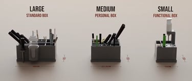 In one sentence: Think of each OrdoBox as a handy grid with 37.5 mm squares – choose SMALL (16 squares), MEDIUM (24 squares) or LARGE (32 squares) depending on what and how many items you want to organise.